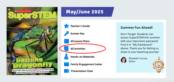 You can see a full list of activities offered with each article or each issue in our print or digital Teacher's Guide.